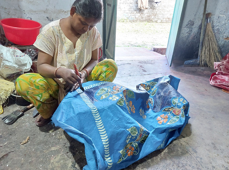Situé à Howrah, l’atelier utilise la technique traditionnelle de teinture batik pour produire des nappes, des draps, des hauts churidar, des tentures murales, des chemisiers, etc. La réalisation d’une seule pièce peut prendre jusqu’à un mois, en raison des différentes couches de couleurs nécessaires. Plus de 200 pièces sont produites par an.