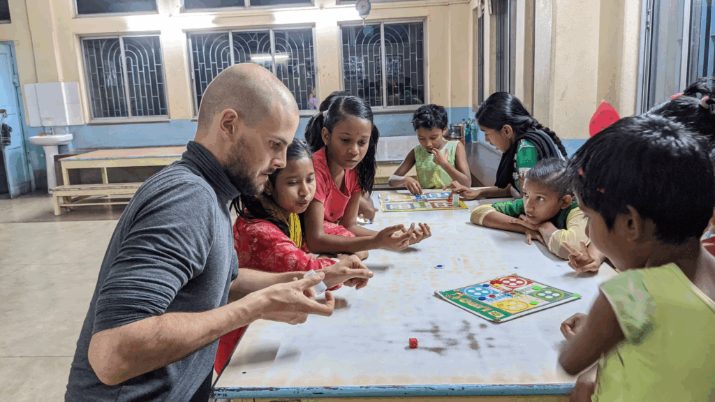 L’après-midi, ils jouent au carrom, résolvent des énigmes et dessinent avec des couleurs, soutenus par les Didis. Certains d’entre eux se déplacent le long des sentiers à l’aide de marcheurs ou de fauteuils roulants pour améliorer leur mobilité.